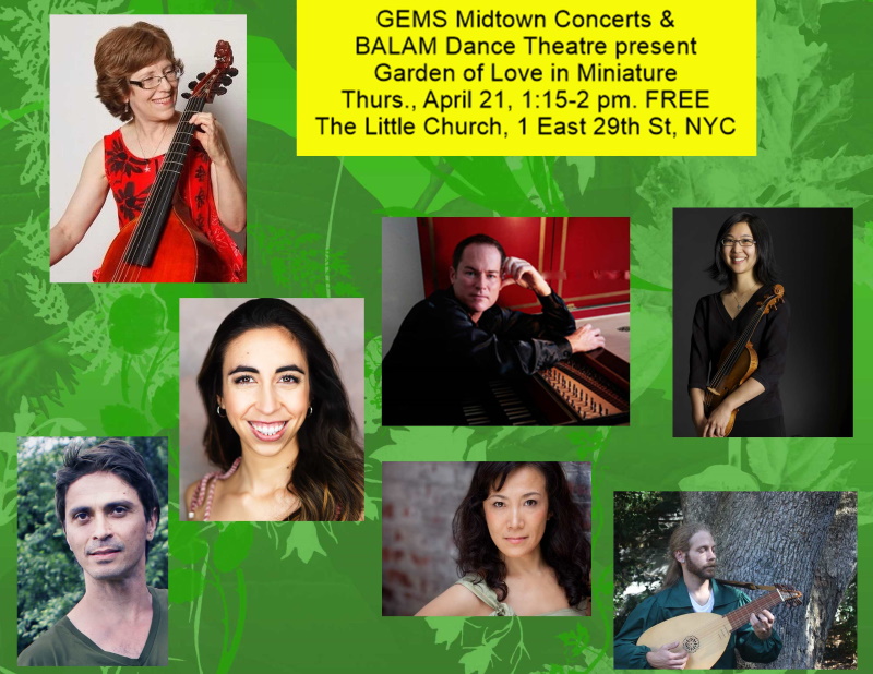 (New York, New York — The vitality of Bali combines with Baroque music, dance, and song in BALAM Dance Theatre’s (BALAM) premiere of Garden of Love in Miniature.  The original and imaginative program will be presented both live and virtually by Midtown Concerts, a project of Gotham Early Music Scene, at Church of the Transfiguration, located at 1 East 29th Street, New York, New York 10016, on Thursday, April 21 from 1:15 to 1:55 p.m. EST.