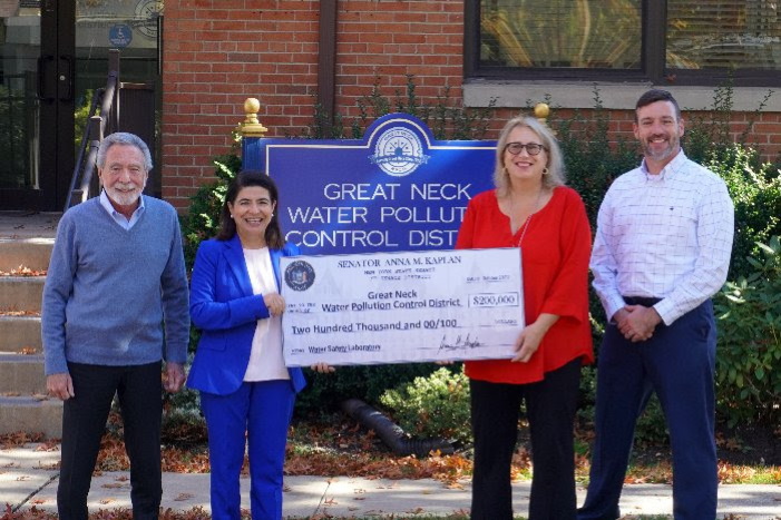 CARLE PLACE, NY (October 30, 2022) – Today, New York State Senator Anna M. Kaplan (D-Port Washington) delivered a $200,000 grant to the Great Neck Water Pollution Control District (GNWPCD) that will fund significant upgrades to the environmental laboratory at GNWPCD’s wastewater treatment plant on East Shore Road in Great Neck. The grant will provide state-of-the-art laboratory equipment that will improve wastewater treatment, better protect the environment, allow for more on-site public health data sampling, and reduce costs at the public utility. Facilities such as this have taken on an even greater role in protecting public health during the pandemic era as a they allow for wastewater surveillance that tracks the spread of COVID-19 and, more recently, Polio.
