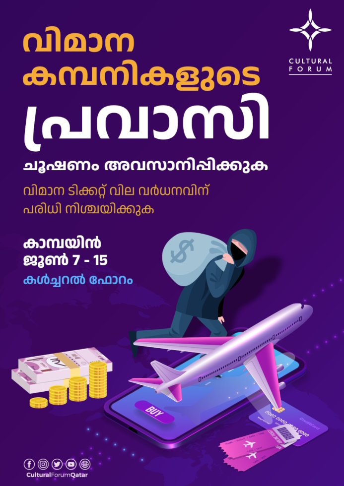 കൂടൂതല് ആളുകള് അവധിക്കായി നാട്ടിലേക്ക് യാത്ര ചെയ്യുന്ന ജൂണ്, ജുലൈ മാസങ്ങളില് വിമാന ടിക്കറ്റിന്റെ മറവില് പ്രവാസികളെ കൊള്ളയടിക്കുന്ന വിമാനക്കമ്പനികളുടെ നടപടിക്കെതിരെയും പതിറ്റാണ്ടുകളായി തുടരുന്ന ഈ സ്ഥിതിവിശേഷം എത്രയും പെട്ടെന്ന് അവസാനിപ്പിക്കും വിധം നിയമ നിർമ്മാണം നടത്തണമെന്നാവശ്യപ്പെട്ടും കള്ച്ചറല് ഫോറം ‘ഉയർന്ന വിമാന യാത്ര നിരക്ക് നിയന്ത്രിക്കുന്നതിന് നിയമം ഭേദഗതി ചെയ്യുക, പ്രവാസി ചൂഷണം അവസാനിപ്പിക്കുക’. എന്ന തലക്കെട്ടില് ക്യാമ്പയിന് ആരംഭിച്ചു.