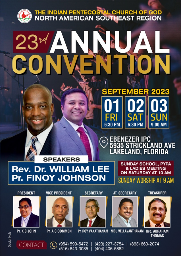 ഫ്ളോറിഡ: ഐപിസി നോർത്ത് അമേരിക്കൻ സൗത്ത് ഈസ്റ്റ് റീജിയൻ 23-ാമത് വാർഷിക കൺവൻഷൻ സെപ്റ്റംബർ 1 മുതൽ 3 വരെ വെള്ളി, ശനി, ഞായർ ദിവസങ്ങളിൽ ലേക്ക് ലാന്റ് എബനേസർ ഐ.പി.സി യിൽ വെച്ച് (5935 Strickland Ave, Lakeland, FL 33812 ) നടത്തപ്പെടും.സുപ്രസിദ്ധ ഉണർവ് പ്രഭാഷകനും പ്രസംഗികനുമായ റവ. ഡോ.വില്യം ലീ മുഖ്യ പ്രഭാഷണം നടത്തും. റീജിയൻ പ്രസിഡന്റ് പാസ്റ്റർ കെ.സി. ജോൺ ഉദ്ഘാടനം നിർവഹിക്കും. പ്രെയ്സ് ആന്റ് വർഷിപ്പിന് റീജിയൻ ക്വയർ നേതൃത്വം നൽകും. വെള്ളി, ശനി ദിവസങ്ങളിൽ വൈകിട്ട് 6.30 മുതൽ പൊതുയോഗം ആരംഭിക്കും.