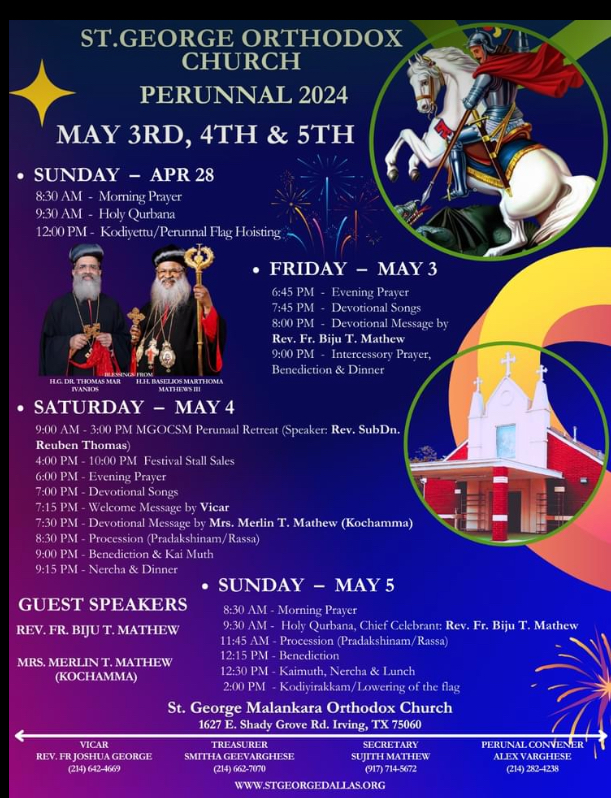 ഡാളസ് : പരിശുദ്ധ ഗീവർഗ്ഗീസ് സഹദായുടെ നാമത്തിലുള്ള നോർത് ടെക്സസ്സിലെ ഏക ദേവാലയമായ ഇർവിങ് സെൻ്റ്. ജോർജ്ജ് ഓർത്തഡോക്സ് ചർച്ചിൽ വി. ഗീവർഗ്ഗീസ് സഹദായുടെ ഓർമ്മപ്പെരുന്നാൾ മെയ് 3, 4, 5 തീയതികളിൽ വിവിധ പരിപാടികളോടെ ഭക്തിപുരസ്സരം കൊണ്ടാടുന്നു ഇടവകയുടെ രക്ഷാധികാരിയായ വിശുദ്ധ ജോർജ്ജ് രക്തസാക്ഷിയുടെ അനുസ്മരണത്തിൽ പങ്കെടുക്കാൻ എല്ലാവരേയും പ്രാർത്ഥനാപൂർവ്വം ക്ഷണിക്കുന്നു. വിശുദ്ധൻ നമുക്കെല്ലാവർക്കും അനുഗ്രഹമായിരിക്കട്ടെയെന്നും കുടുംബാംഗങ്ങളും സുഹൃത്തുക്കളും ആരാധനാ ശുശ്രൂഷകളിലും മറ്റ് ആഘോഷങ്ങളിലും ഞങ്ങളോടൊപ്പം ചേരാൻ ക്ഷണിക്കുന്നതായും സംഘാടകർ അറിയിച്ചു