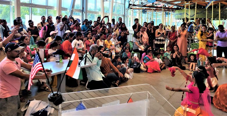 Stamford, CT: The Mill River Park in Stamford, CT on Sunday, August 7th wore a festive look as Indian Americans and other Americans gathered in large numbers to celebrate India’s 75th Independence Day with an annual India Day Festival. A floating crowd of over 2,000 people attended flag hoisting followed by the India Festival and Kite flying at the Mill River Park. Dressed in colorful traditional Indian attire, with melodious music from the popular Bollywood world, dances depicting the wide variety of Indian culture, kite flying, spicy Indian cuisine, and booths decorated with Indian symbols and face art, the festivities were a treat to the fast-growing Indian American community in the state of Connecticut.