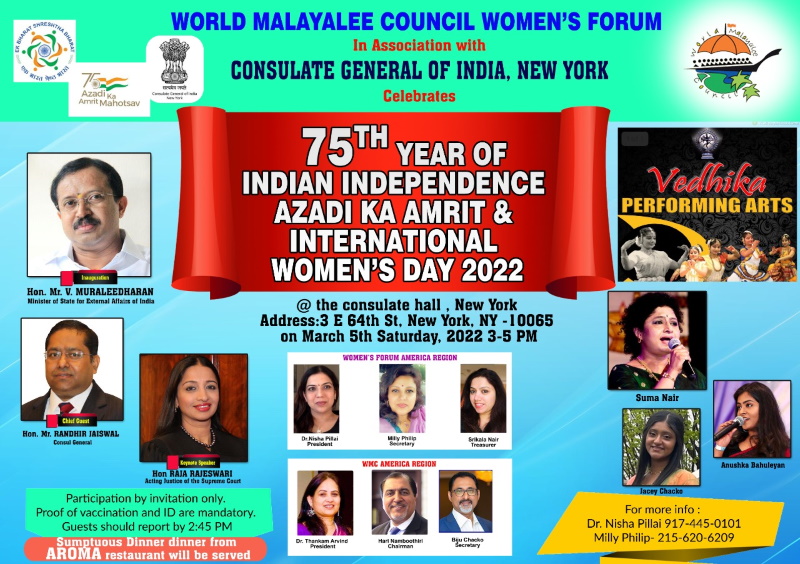 ഫിലഡല്ഫിയ: വേൾഡ് മലയാളി കൗൺസിൽ അമേരിക്ക റീജിയൻ വിമൻസ് ഫോറവും ന്യൂയോര്ക്ക് ഇന്ത്യന് കോണ്സുലേറ്റും സംയുക്തമായി ഇന്റർനാഷണൽ വിമൻസ് ഡേയും ഇന്ത്യയുടെ എഴുപത്തിയഞ്ചാം സ്വാതന്ത്ര്യ വാർഷികത്തോട് അനുബന്ധിച്ച് ആസാദി കാ അമൃത് മഹോത്സവും ന്യൂയോക്ക് കോന്സുലേറ്റ് ആസ്ഥാനത്ത് വെച്ച് മാർച്ച് 5 ശനിയാഴ്ച ഉച്ച കഴിഞ്ഞ് 3:00 മണിമുതല് 5:00 മണിവരെ നടത്തുന്നു. കോൺസുലേറ്റ് ജനറൽ ഓഫ് ഇന്ത്യ രൺദീപ് ജയ്സ്വാൾ മുഖ്യാതിഥിയായും, യു എസ് സുപ്രീം കോടതി ആക്റ്റിംഗ് ജഡ്ജി രാജരാജേശ്വരി മുഖ്യ പ്രാസംഗികയായും സമ്മേളനത്തിൽ പങ്കെടുക്കുന്നതാണ്.