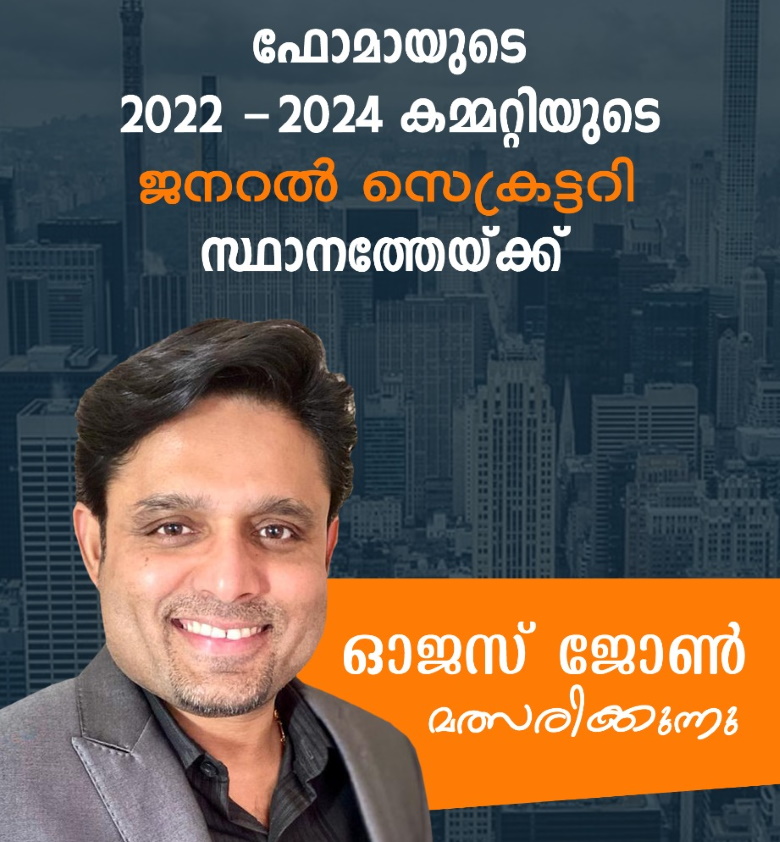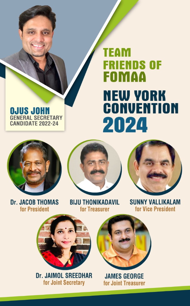 ഫോമയുടെ പ്രവർത്തനങ്ങൾക്ക് പുതിയ ദിശാമുഖം നൽകാൻ ഡോക്ടർ ജേക്കബ് തോമസ് പ്രസിഡന്റ് ആയും ബിജു തോണിക്കടവിൽ (ട്രഷറർ) സണ്ണി വള്ളിക്കളം (വൈസ് പ്രസിഡന്റ്) ഡോക്ടർ ജെയ്മോൾ ശ്രീധർ (ജോയിന്റ് സെക്രട്ടറി) ജെയിംസ് ജോർജ് (ജോയിന്റ് ട്രെഷറർ) സ്ഥാനത്തേക്കും ജനവിധി തേടുന്ന ടീം ഫ്രണ്ട്സ് ഓഫ് ഫോമയുടെ ജനറൽ സെക്രട്ടറിയായി മത്സരിക്കുന്ന ഓജസ് ജോൺ ഉൾപ്പെടുന്ന ഡ്രീം ടീമിനു സാധിക്കുമെന്നും അതുവഴി ടീം ലക്ഷ്യമിടുന്ന ന്യൂ യോർക്ക് ഫാമിലി കൺവെൻഷൻ – 2024 സാധ്യമാവുമെന്നും ഓജസ് ജോൺ പ്രത്യാശ പ്രകടിപ്പിച്ചു.