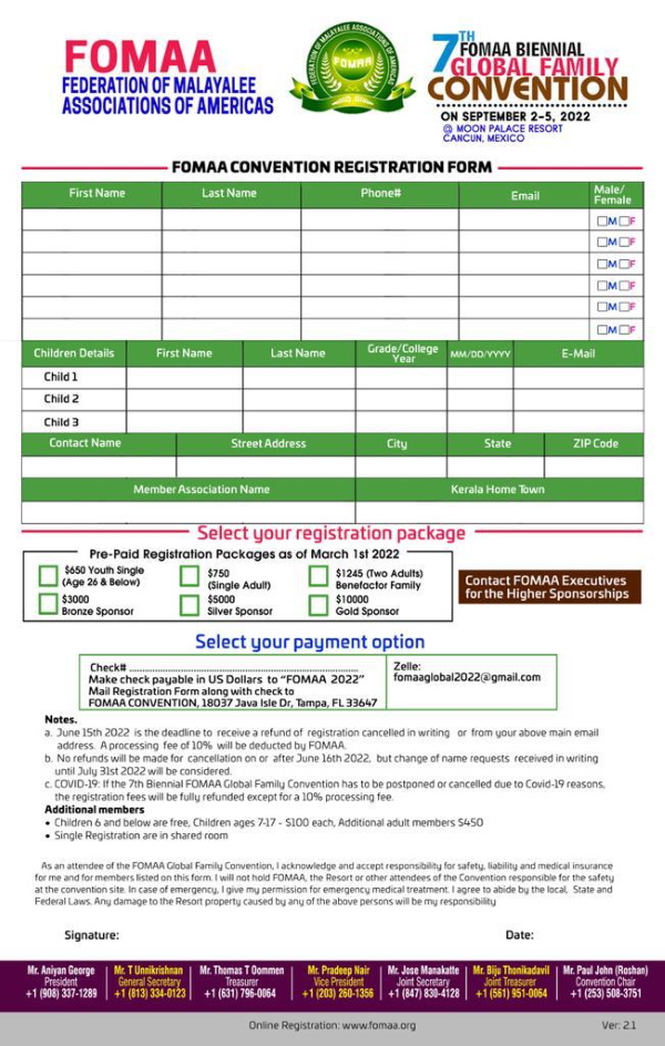 രജിസ്ട്രേഷൻ വിവരങ്ങൾക്കായി ഫോമാ എക്സിക്യൂട്ടീവ് ഭാരവാഹികളായ പ്രസിഡന്റ് അനിയൻ ജോർജ്ജ്, ജനറൽ സെക്രട്ടറി ടി.ഉണ്ണികൃഷ്ണൻ, ട്രഷറർ, തോമസ് ടി.ഉമ്മൻ, വൈസ് പ്രസിഡന്റ് പ്രദീപ് നായർ, ജോയിന്റ് സെക്രട്ടറി ജോസ് മണക്കാട്ട്, ജോയിന്റ് ട്രഷറർ ബിജു തോണിക്കടവിൽ, കൺവെൻഷൻ ചെയർമാൻ പോൾ ജോൺ (റോഷൻ) എന്നിവരേയോ മറ്റ് നാഷണൽ കമ്മിറ്റി അംഗങ്ങൾ, കൺവെൻഷൻ കമ്മിറ്റി എന്നിവരെയോ ബന്ധപ്പെടേണ്ടതാണ്.