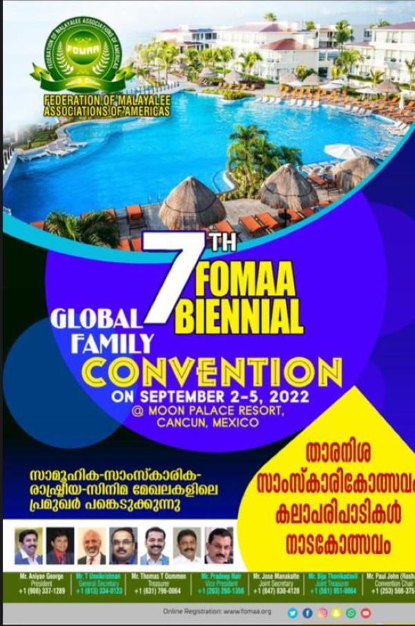 നോർത്ത് അമേരിക്കൻ മലയാളികൾ പ്രത്യേകിച്ചു ഫോമയുടെ അംഗസംഘടനകകൾ ആവേശത്തോടെ കാത്തിരിക്കുന്ന ഫോമാ ഗ്ലോബൽ ഫാമിലി കൺവൻഷൻ 2022 സെപ്റ്റംബർ 2 മുതൽ 5 വരെ മെക്സിക്കോയിലെ കൻകൂണിൽ നടക്കും. കൻകൂണിലെ ഏറ്റവും പ്രശസ്തമായ മൂൺപാലസ് റിസോർട്ടിൽ വെച്ചാണ് സമ്മേളനം നടക്കുക. ആദ്യമായാണ് ഒരു അമേരിക്കൻ മലയാളി സംഘടന അമേരിക്കക്കും , കാനഡയ്ക്കും പുറത്തു കൺവെൻഷൻ സംഘടിപ്പിക്കുന്നതെന്ന പ്രത്യേകതയുണ്ട്. നോർത്ത് അമേരിക്കൻ മലയാളികളെ ഒന്നിപ്പിക്കുന്ന, ജനസേവനത്തിന്റെയും, കാരുണ്യ സേവനത്തിന്റെയും പാതയിൽ അഭിമാനമായ ഫോമാ എല്ലാ മലയാളികൾക്കും ഒത്തുചേരാനും, പരസ്പരം വിശേഷങ്ങളും, സ്നേഹവും പങ്കുവെക്കാനും ഒരുക്കുന്ന വേദിയാണ് രാജ്യാന്തര കുടുംബ സംഗമം.