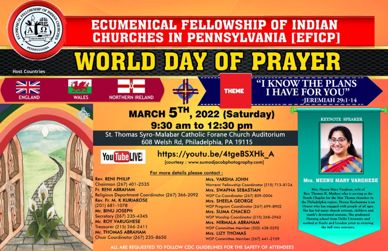 ഫിലഡല്ഫിയ: ഫിലഡല്ഫിയയിലെ വിശ്വാസ സമൂഹത്തിന് പ്രാര്ത്ഥനാ ദിനമായി ആഘോഷിക്കുവാനായി വര്ഷങ്ങളായി ഫിലഡല്ഫിയ എക്യുമെനിക്കല് ഫെലോഷിപ്പിന്റെ നേതൃത്വത്തില് നടന്നു വരുന്ന അഖില ലോക പ്രാര്ത്തനാ ദിനം ഈ വര്ഷവും 2022 മാര്ച്ച് 5 ശനിയാഴ്ച നടക്കും. ഫിലഡല്ഫിയയിലെ 608 വെല്ഷ് റോഡിലുള്ള സെന്റ് തോമസ് സീറോ മലബാര് കാത്തലിക് ഫൊറേനാ ചര്ച്ചില് രാവിലെ കൃത്യം 9.30 ന് ചടങ്ങുകള് ആരംഭിക്കുമെന്ന് ഈ.എഫ്.ഐ.സി.പി വിമന്സ് ഫോറം കോര്ഡിനേറ്റര് വര്ഷാ ജോണ് അറിയിച്ചു. കോവിഡ് പ്രോട്ടോക്കോള് പാലിച്ച് കൊണ്ട് നടത്തുന്ന പ്രാര്ത്ഥനാ ദിന പരിപാടിയില് ആളുകള്ക്ക് നേരിട്ടും വെര്ച്വല് പ്ളാറ്റുഫോമിലൂടെയും പരിപാടി സംപ്രേഷണം ചെയ്യുന്നതാണെന്ന് ഭാരവാഹികള് അറിയിച്ചു.