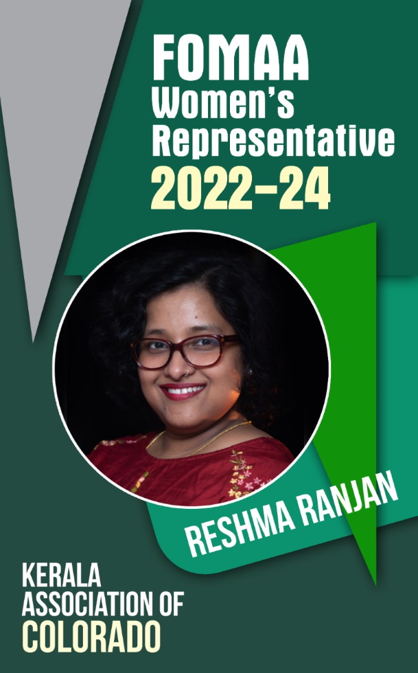 കൊളറാഡോ: ഫോമാ 2022 – 24 കാലഘട്ടത്തിലേക്കുള്ള കമ്മറ്റിയുടെ വനിതാ പ്രതിനിധി സ്ഥാനത്തേക്ക് കേരള അസോസിയേഷൻ ഓഫ് കൊളറാഡോയെ പ്രതിനിധീകരിച്ച് രേഷ്മ രഞ്ജൻ മത്സരിക്കുന്നു.