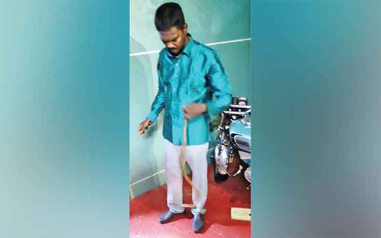 രാത്രി എട്ടരയോടെയാണു സുരേഷ് എത്തിയത്. ബൈക്ക് മൂടിയിരുന്ന കവര്‍ നീക്കിയതോടെ ഹാന്‍ഡിലിനടിയില്‍ ചുറ്റിക്കിടന്ന പാമ്പിനെ നിമിഷങ്ങള്‍ക്കുള്ളില്‍ത്തന്നെ വാവ സുരേഷ് പിടികൂടി വീട്ടുകാര്‍ കരുതിയിരുന്ന പ്ലാസ്റ്റിക് ടിന്നിലാക്കി. വാവ സുരേഷിനു നാട്ടുകാര്‍ സ്വീകരണംനല്‍കി.