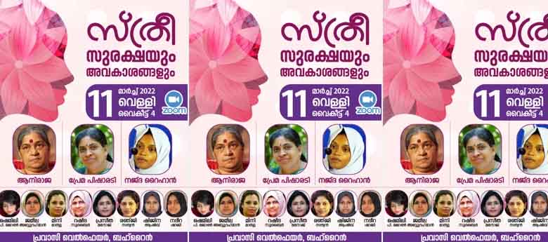 മാര്ച്ച് 11 നു (വെള്ളി) വൈകുന്നേരം നാലിന് സൂം വെര്ച്വല് പ്ലാറ്റ്ഫോമില് നടക്കുന്ന വെബിനാറില് വെല്ഫെയര് പാര്ട്ടി സംസ്ഥാന പ്രവര്ത്തക സമിതിയംഗം പ്രേമ. ജി. പിശാരടി മുഖ്യ പ്രഭാഷണം നടത്തും. ഫ്രറ്റേണിറ്റി സംസ്ഥാന പ്രസിഡന്റ് നജ്ദാ റൈഹാന് വിശിഷ്ടാതിഥിയായി എത്തുന്ന സംഗമത്തില് ബഹറിനിലെ സാമൂഹിക സാംസ്കാരിക മേഖലയില്. പ്രവര്ത്തിക്കുന്ന വനിതാ പ്രമുഖരും പങ്കെടുക്കുമെന്ന് പ്രവാസി വെല്ഫെയര് സെക്രട്ടറി ഷിജിന ആഷിക് അറിയിച്ചു