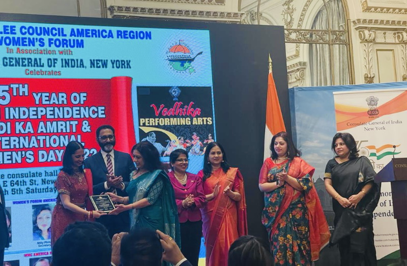 ഫിലഡൽഫിയ വേൾഡ് മലയാളി കൗൺസിലിന്റെ നേതൃത്വത്തിൽ ഇന്ത്യൻ കോൺസുലേറ്റിൽ വെച്ച് ഇന്ത്യൻ നാഷണൽ വിമൻസ് ഡേയും ആസാദി കാ മഹോത്സവവും കൊണ്ടാടി. ഡബ്ല്യു എം സി അമേരിക്ക റീജിയൻ പ്രസിഡന്റ് ഡോ തങ്കം അരവിന്ദ് സ്വാഗതമാശംസിച്ചു. ഡബ്ല്യുസിസി അമേരിക്ക റീജിയൻ വുമൻസ് ഫോറം പ്രസിഡന്റ് ഡോ. നിഷ പിള്ള ആമുഖ പ്രസംഗത്തിൽ, ഭാരതത്തെ എല്ലാ കഴിവുകളും കൂടിയ സുന്ദരിയായ പ്രിയയോട് ഉപമിച്ചുകൊണ്ടായിരുന്നു സംസാരിച്ചത്. അവളിൽ ആകൃഷ്ടയായി സ്നേഹം നടിച്ച് എത്തിയവരുടെ അധിനിവേശത്തിൽ പതറി പോകാതെ അഹിംസയിലൂടെ അധർമത്തെ നേരിട്ട് സ്വാതന്ത്ര്യം നേടിയെടുത്ത ഭാരതാംബയെ സാഷ്ടാംഗം നമിച്ച് കൊണ്ടാണ് കഥ പൂർത്തിയാക്കിയത്. പതാകയിലെ മൂന്നു നിറങ്ങൾ സ്ത്രീത്വത്തിന് ഗുണങ്ങളെ പ്രതിനിധീകരിക്കുന്നത് പച്ചനിറം സമൃദ്ധിയും സ്വാശ്രയതയും വെള്ളനിറം സമാധാനത്തെയും കുങ്കുമ വർണ്ണം ത്യാഗങ്ങളിലൂടെ നേട്ടങ്ങൾ കൊയ്യുന്നതും സൂചിപ്പിക്കുന്നു. ലിംഗ സമത്വമുള്ളഒരു രാജ്യമല്ല നമ്മൾ ആഘോഷിക്കുന്നത് സ്ത്രീകളെ അല്ല മറിച്ച് സമൂഹത്തിൽ മാറ്റം കൊണ്ടുവരുവാൻ ആവശ്യമായ സ്ത്രീത്വം ഗുണങ്ങളാണ് എന്ന നിഷാ പിള്ള വ്യക്തമാക്കി.