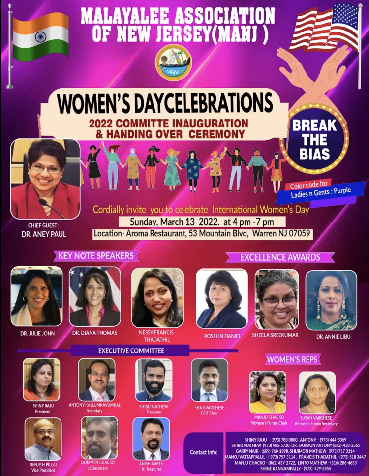 ന്യൂജേഴ്സി: മലയാളി അസോസിയേഷന് ഓഫ് ന്യൂജേഴ്സി (MANJ) യുടെവും അന്താരാഷ്ട്ര വനിതാ ദിനാഘോഷവും 2021-2023 ഭരണസമിതിയുടെ പ്രവർത്തനോദ്ഘാടനവും മാർച്ച് 13 നു (നാളെ) വിപുലമായ പരിപാടികളോടെ ആഘോഷിക്കുന്നു. മാര്ച്ച് 13ന് വൈകുന്നേരം 4നു ന്യൂജേഴ്സിയിലെ വാറനിലുള്ള ആരോമ റസ്റ്റോറന്റില് വച്ച് നടക്കുന്ന ആഘോഷ പരിപാടികൾ ന്യൂയോർക്കിലെ റോക്ക് ലാൻഡ് കൗണ്ടി ലെജിസ്ലേച്ചർ ഡോ. ആനി പോൾ ഉദ്ഘാടനം ചെയ്യും. അഡ്രസ്: 53 Mountain Brvd, Warren, NJ 07059.