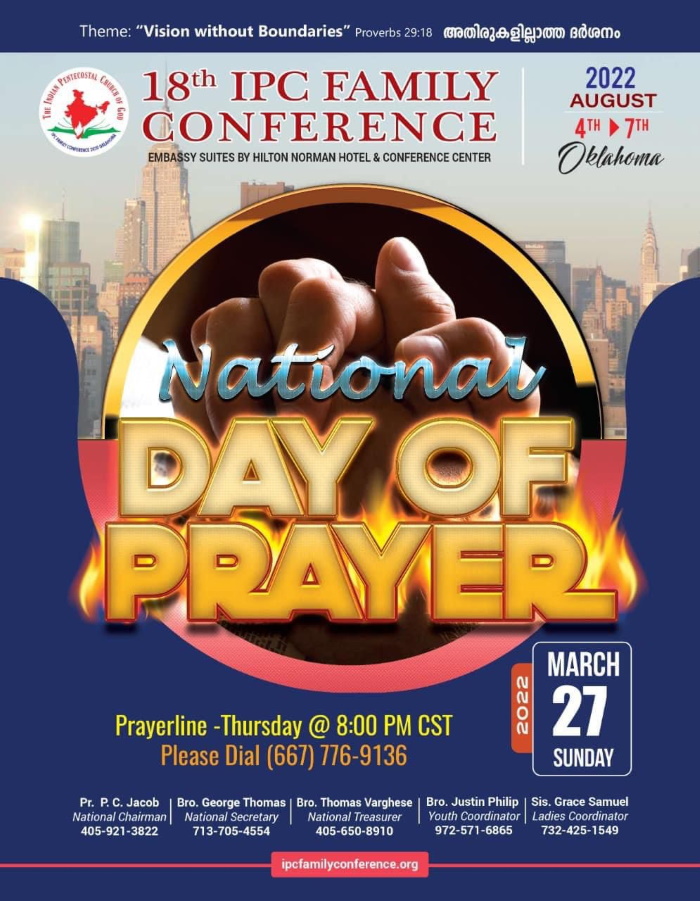 ഐ.പി.സി ഫാമിലി കോൺഫ്രൻസ്‌: ദേശീയ പ്രാർത്ഥനാ ദിനം മാർച്ച് 27 ന്; മാർച്ച് 19ന് ഡാളസിൽ പ്രമോഷണൽ യോഗം