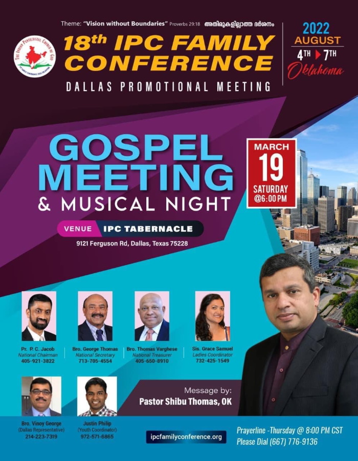 കോൺഫ്രൻസിന്റെ വിജയകരമായ നടത്തിപ്പിനുവേണ്ടി മാർച്ച് 19ന് ശനിയാഴ്ച വൈകിട്ട് 6 മണിക്ക് ഡാളസ് ഐ.പി.സി ടാബർനാക്കിൾ സഭാലയത്തിൽ പ്രമോഷണൽ യോഗവും സംഗീത ശുശ്രുഷയും നടത്തപ്പെടും. പാസ്റ്റർ ഷിബു തോമസ് ഒക്ലഹോമ മുഖ്യ പ്രഭാഷണം നടത്തും.