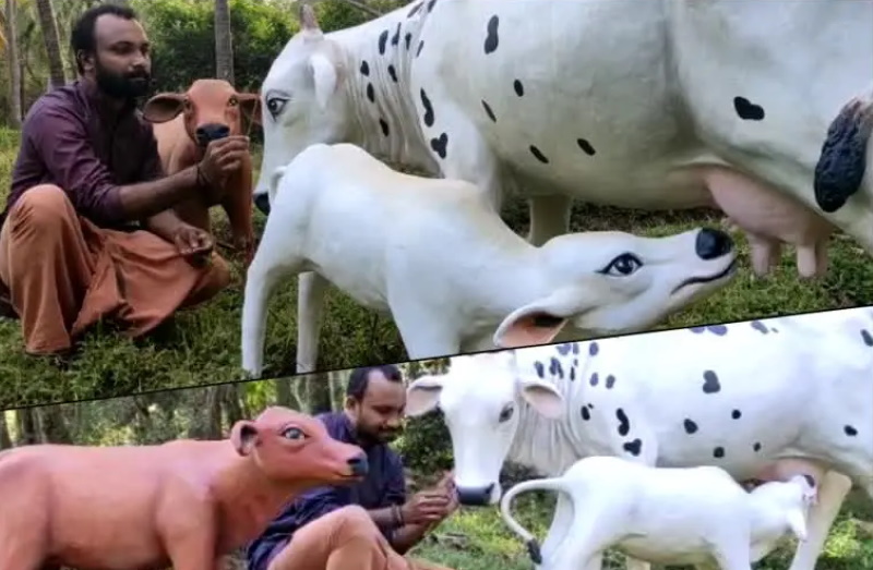 പുള്ളികളോടുകൂടിയ വെളുത്ത പശു. ഒപ്പം ഓമനത്വം തുളുമ്പുന്ന പശുകുട്ടികള് ചുറ്റും. ഒന്ന് പാൽ കുടിക്കുന്നു, മറ്റൊന്ന് തള്ളപശുവിനെ നോക്കി നില്ക്കുകയും ചെയ്യുന്നതാണ് ശില്പങ്ങള്. കളിമണ്ണിൽ നിർമിച്ച ശില്പം പ്ലാസ്റ്റർ ഓഫ് പാരിസിൽ മോൾഡ് ചെയ്തശേഷം ഫൈബർ ഗ്ലാസുമുപയോഗിച്ചാണ് പൂർത്തിയാക്കിയത്. കലാവിരുത് കാണാന് നിരവധി പേരാണ് ചിത്രന്റെ പണിപ്പുരയിലേക്ക് എത്തുന്നത്.