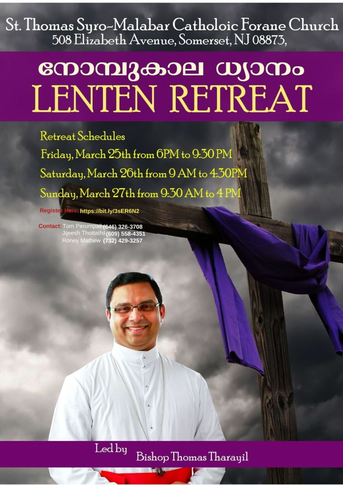 ന്യൂജേഴ്സി: പ്രശസ്ത സുവിശേഷ പ്രാസംഗികനും, ധ്യാന ഗുരുവും, മനഃശാസ്ത്രജ്ഞനുമായ ചങ്ങനാശ്ശേരി അതിരൂപത സഹായമെത്രാൻ ബിഷപ്. മാർ. തോമസ് തറയിൽ നയിക്കുന്ന നോമ്പുകാല കുടുംബ നവീകരണ ധ്യാനം, സോമർസെറ്റ് സെൻറ്.തോമസ് സീറോ മലബാർ കത്തോലിക്ക ഫൊറോനാ ദേവാലയത്തിൽ, മാർച്ച് 25- മുതൽ 27-വരെ (വെള്ളി, ശനി, ഞായർ) തീയതികളിലായി നടത്തപ്പെടുന്നു.