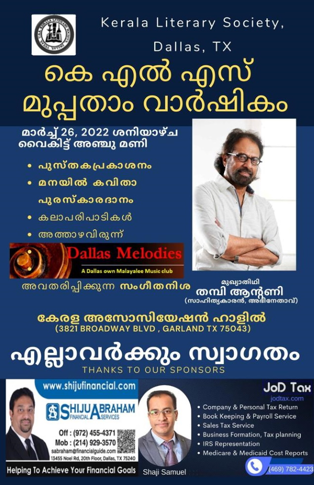 ഡാളസ്: മുപ്പതാം വർഷത്തിലേക്കു കടക്കുന്ന കേരള ലിറ്റററി സൊസൈറ്റി ഡാളസ് (കെഎൽഎസ്) ന്റെ വിപുലമായ വാർഷികാഘോഷ പരിപാടികൾ മാർച്ച് 26 ശനിയാഴ്ച വൈകീട്ട് 5:00 മണിക്ക് കേരളാ അസ്സോസിയേഷൻ ഹാളിൽ (3821 Broadway Blvd, Garland TX 75043) വെച്ച് സംഘടിപ്പിക്കുന്നു.