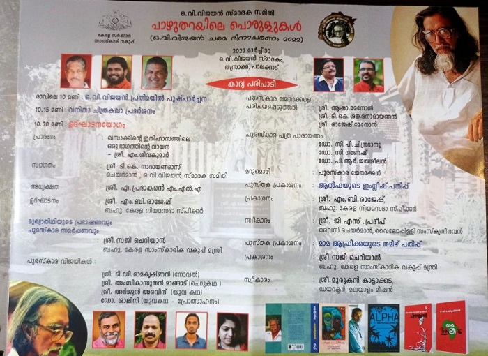 മാര്ച്ച് 30 ബുധനാഴ്ച രാവിലെ പത്തു മണിക്ക് പാലക്കാടിന് അടുത്തുള്ള തസ്രാക്കിലെ ഓ.വി. വിജയന് സ്മാരകത്തില് വെച്ച് ബഹു. സാംസ്കാരിക വകുപ്പ് മന്ത്രി സജി ചെറിയാനാണ് അവാര്ഡ് വിതരണം നടത്തുന്നത്. അതേ വേദിയില് ആൽഫ ഇംഗ്ലീഷ് പരിഭാഷ ബഹു. സ്പീക്കര് എം.ബി.രാജേഷും, മാമ ആഫ്രിക്കയുടെ തമിഴ് വിവര്ത്തനം സജി ചെറിയാനും പ്രകാശനം ചെയ്യും.