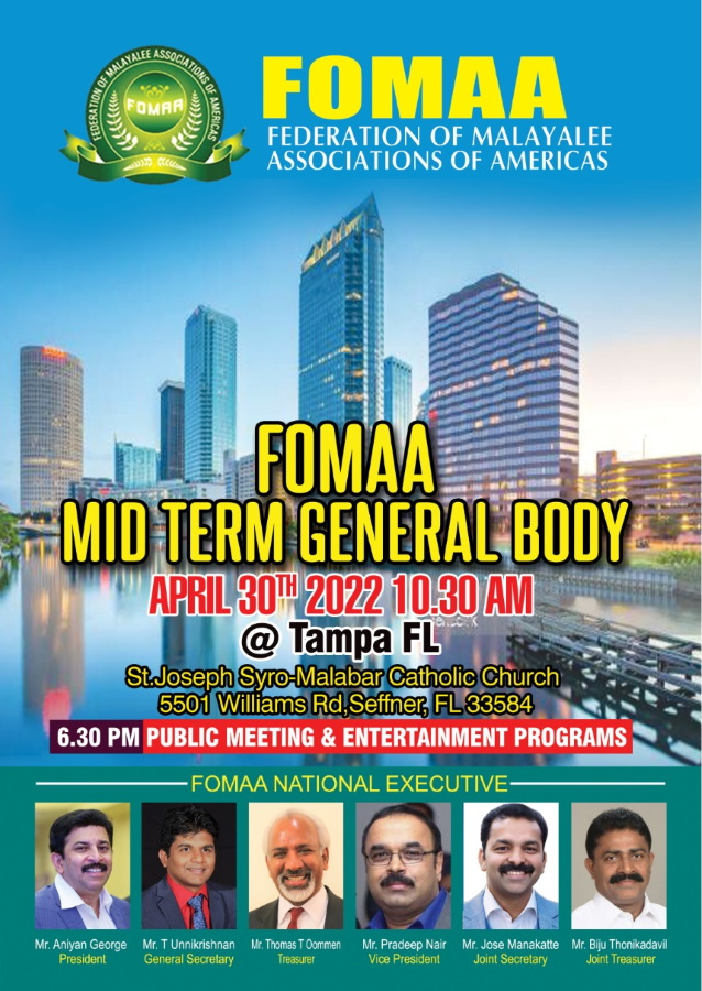പ്രവർത്തന മികവുകൊണ്ടും, സുതാര്യത കൊണ്ടും, ഏറ്റെടുത്ത ജനസേവന- കാരുണ്യ പ്രവർത്തികളുടെ പൂർത്തീകരണം കൊണ്ടും, പ്രവാസി മലയാളികളുടെയും, അംഗസംഘടനകളുടെയും പ്രിയപ്പെട്ട പ്രസ്ഥാനമായ ഫോമായുടെ 2020-2022 സമിതിയുടെ ഇടക്കാല പൊതുയോഗം 2022 ഏപ്രിൽ മുപ്പതിന് ഫ്ലോറിഡയിലെ റ്റാമ്പായിൽ നടക്കും. സെഫ്നറിലെ സെന്റ് ജോസഫ് സീറോ മലബാർ കാത്തലിക് പള്ളിയുടെ ഓഡിറ്റോറിയമാണ് പൊതുയോഗ വേദി.