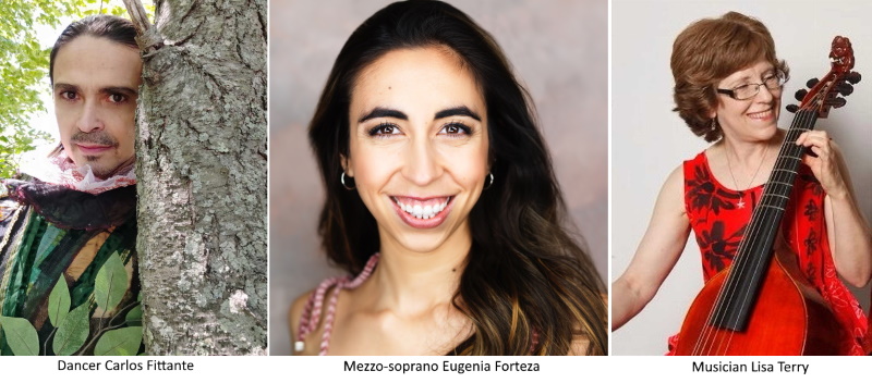 BALAM, a non-profit, professional dance theatre company based in New York City, offers a new vision of contemporary cultural dance by combining diverse dance styles from around the world and historic periods with ballet and modern.  The company’s new program opens with the stunning Entrée d’Apollon, a notated Baroque dance solo, circa 1701, performed by Baroque choreographer and dancer Carlos Fittante.  BALAM dancer Yumiko Niimi performs an Allemande, as a masked bird character, with Fittante reappearing as a masked deer.  Eugenia Forteza, guest mezzo-soprano, debuts with the company, as the fictious Madama Amorina, a famous Baroque actress visiting the garden of love to meet a secret admirer