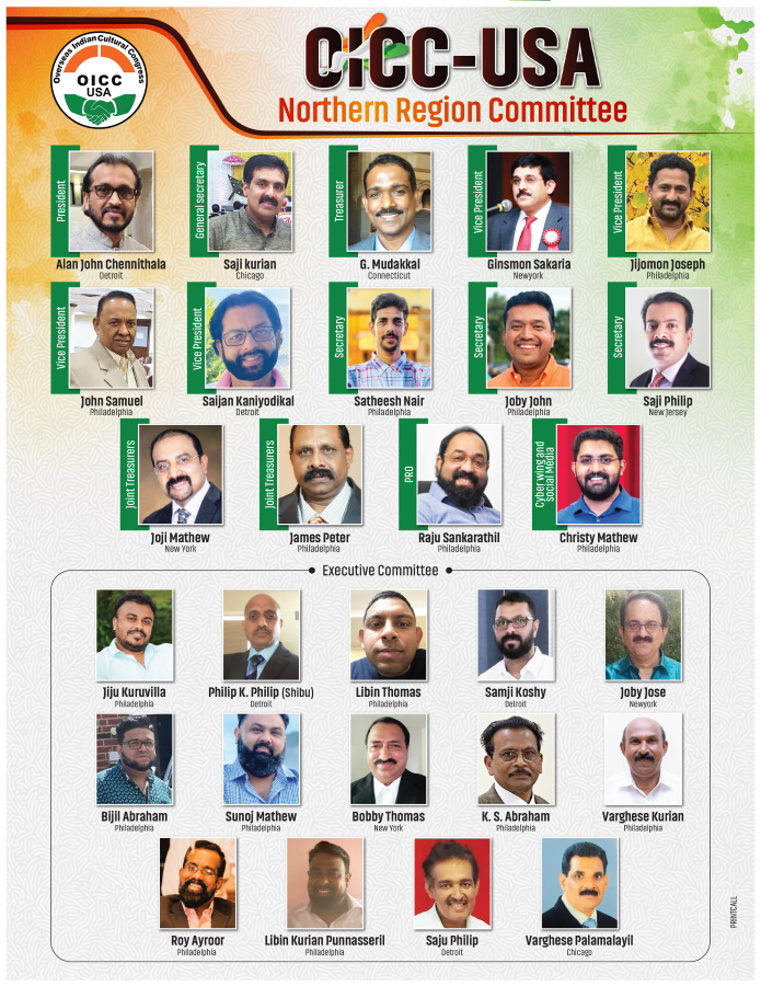 ന്യൂയോർക്ക് : ഓവർസീസ് ഇന്ത്യൻ കൾച്ചറൽ കോൺഗ്രെസ് (ഒഐസിസി) യുഎസ്എ നോർത്തേൺ റീജിയൻ ഭാരവാഹികളെ കെപിസിസി പ്രസിഡന്റ് കെ. സുധാകരന്റെ ഔദ്യോഗീക അംഗീകാരത്തിനു വിധേയമായി ഒഐസിസി ഗ്ലോബൽ ചെയർമാൻ ശങ്കരപ്പിള്ള കുമ്പളത്ത് പ്രഖ്യാപിച്ചു.
