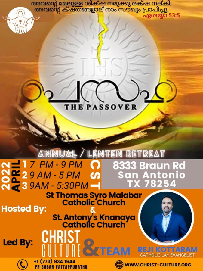 സാൻ അന്റോണിയോ (ടെക്‌സാസ്): അനുഗ്രഹീത വചന പ്രഘോഷകനായ ബ്രദര്‍ റജി കൊട്ടാരത്തിന്റെ നേതൃത്വത്തിൽ ക്രൈസ്റ്റ് കൾച്ചർ മിനിസ്ട്രി ടീം നയിക്കുന്ന പെസഹാ നോമ്പുകാല ധ്യാനം അമേരിക്കയിൽ ആരംഭിച്ചു.