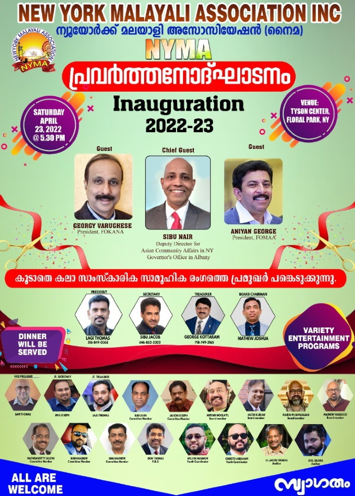 ന്യൂയോർക്ക് : ന്യൂയോർക്ക് മലയാളി അസോസിയേഷൻ (നൈമ)യുടെ പ്രവർത്തനോദ്ഘാടനം ഏപ്രിൽ 23 വൈകിട്ട് 5.30ന് നടക്കും. ഫ്ളോറൽ പാർക്കിലെ ടൈസൻ സെന്ററിൽ നടക്കുന്ന ഉദ്ഘാടന ചടങ്ങിൽ ഏഷ്യൻ കമ്യൂണിറ്റി അഫെയേർസ് ഡപ്യൂട്ടി ഡയറക്ടർ ഷിബു നായർ മുഖ്യതിഥിയായി പങ്കെടുക്കും. ഫൊക്കാന പ്രസിഡന്റ് ജോർജി വർഗീസ്, ഫോമ പ്രസിഡന്റ് അനിയൻ ജോർജ്ജ് എന്നിവർ മുഖ്യാതിഥികളാവും. കൂടാതെ കലാ സംസ്കാരിക മേഖലകളിൽ പ്രവർത്തിക്കുന്ന പല പ്രെമുഖരും പങ്കെടുക്കും.