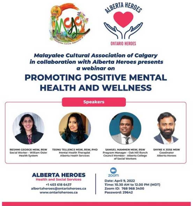 കാൾഗറി: ആൽബർട്ട ഹീറോസും കാൾഗറി മലയാളി അസോസിയേഷനും സംയുകതമായി പോസിറ്റീവ് മെന്റൽ ഹെൽത്ത് ആൻഡ് വെൽനെസ്സ് എന്ന വിഷയത്തെക്കുറിച്ച് വെബ്ബിനാർ സംഘടിപ്പിക്കുന്നു. 2022 ഏപ്രിൽ 9 ന് ശനിയാഴ്ച ആൽബർട്ട സമയം രാവിലെ 10:30 മുതൽ ഉച്ചയ്ക്ക് 12 മണി വരെയാണ് വെബ്ബിനാർ സംഘടിപ്പിച്ചിരിക്കുന്നത്.