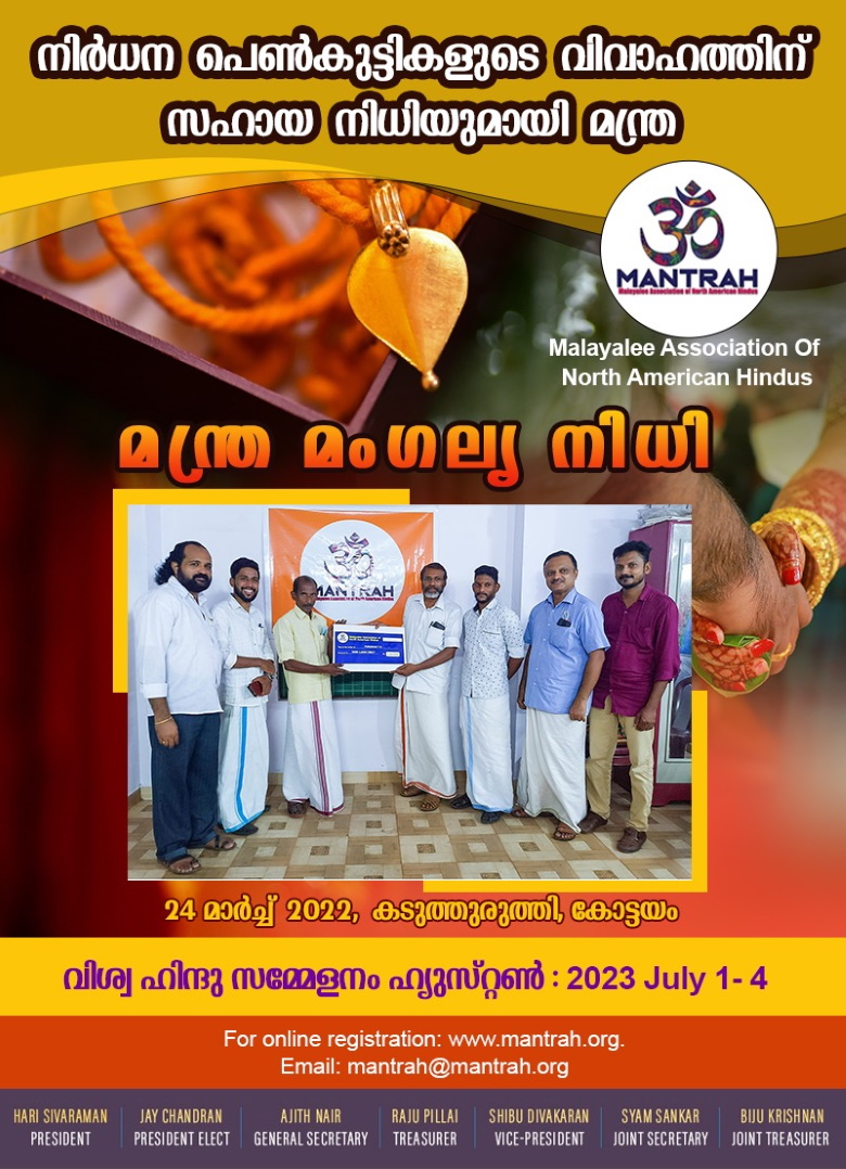 മലയാളി അസ്സോസിയേഷൻ ഓഫ് നോർത്ത് അമേരിക്കൻ ഹിന്ദുസ് (മന്ത്ര) സാമ്പത്തികമായി പിന്നോക്കം നിൽക്കുന്ന പെൺകുട്ടികൾക്കു വിവാഹ സഹായത്തിനായി പ്രഖ്യാപിച്ച മംഗല്യ നിധിയുടെ ആദ്യ സഹായം ഒരു ലക്ഷം രൂപ കോട്ടയം ജില്ലയിലെ കടുത്തുരുത്തിയിലെ ടി കെ പുരുഷന് സമ്മാനിച്ചു. പിന്നോക്ക സമൂഹ ക്ഷേമ പ്രവർത്തനങ്ങളിൽ സജീവമായ അദ്ദേഹത്തിന്റെ മകളുടെ വിവാഹം നടന്ന മാർച്ച് 27 നു മുൻപ് സഹായം എത്തിച്ചു.