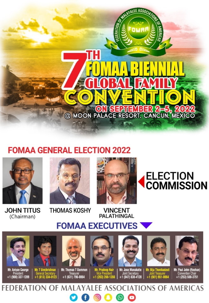 ഫോമയുടെ 2022-2024 കാലത്തേക്കുള്ള പുതിയ ഭരണ സമിതിയുടെ തെരെഞ്ഞെടുപ്പ് സുതാര്യമായും, നിഷ്പക്ഷമായും നടത്തുന്നതിന്, ശ്രീ ജോൺ ടൈറ്റസ് ചെയർമാനായും, തോമസ് കോശി, വിത്സൺ പാലത്തിങ്കൽ എന്നിവർ അംഗങ്ങളായും തെരെഞ്ഞെടുപ്പ് കമ്മീഷനെ തെരഞ്ഞെടുത്തു.