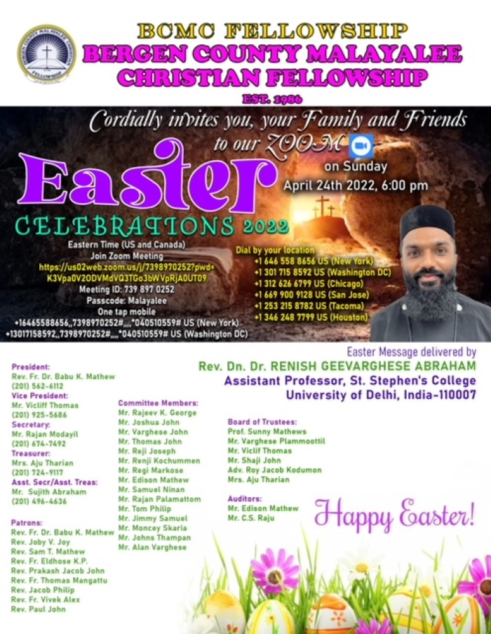 ബര്ഗന്ഫീല്ഡ് (ന്യൂജേഴ്സി): നോര്ത്ത് ന്യൂജേഴ്സിയിലെ മലയാളി ക്രിസ്ത്യാനികളുടെ ആദ്യകാല എക്യുമെനിക്കല് കൂട്ടായ്മയായ ബര്ഗന് കൗണ്ടി മലയാളി ക്രിസ്ത്യന് ഫെലോഷിപ്പിന്റെ ഈസ്റ്റര് ആഘോഷം 2022 ഏപ്രില് 24 ഞായറാഴ്ച വൈകുന്നേരം 6 മണിക്ക് സൂം വഴി നടത്തപ്പെടുന്നതാണ്.
