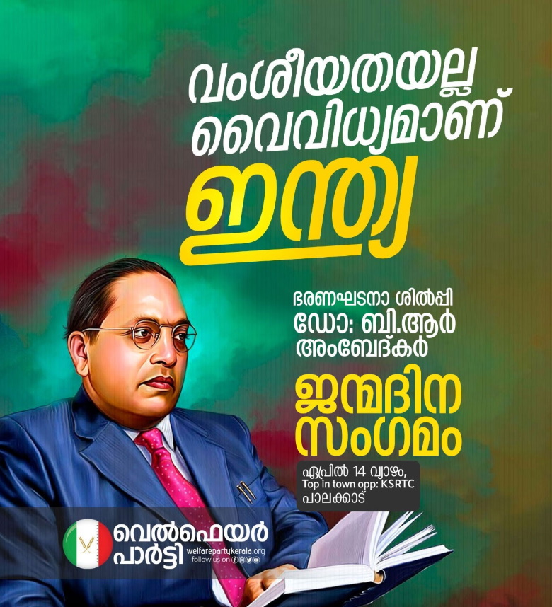 വെൽഫെയർ പാർട്ടി കേരള സംസ്ഥാന കമ്മിറ്റിയുടെ ആഭിമുഖ്യത്തിൽ “വംശീയതയല്ല, വൈവിധ്യമാണ് ഇന്ത്യ” എന്ന തലക്കെട്ടിൽ ഭരണഘടനാ ശിൽപ്പി ഡോ: ബി.ആർ അംബേദ്കർ ജന്മദിന സംഗമം 2022 ഏപ്രിൽ 14 വ്യാഴം രാവിലെ 10 മണിക്ക് പാലക്കാട് കെ.എസ്.ആർ.ടി.സി യ്ക്ക് സമീപമുള്ള ടോപ് ഇൻ ടൌണിൽ നടക്കും.