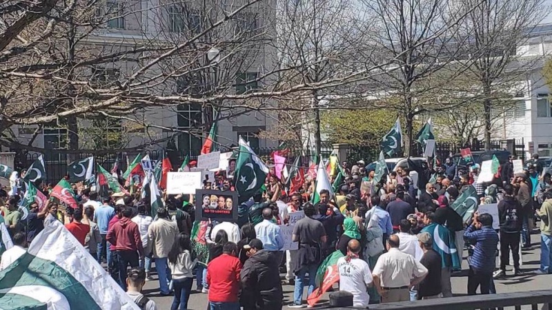 ഖാൻ സർക്കാരിനെ അട്ടിമറിക്കുന്നതിൽ യുഎസ് പ്രസിഡന്റ് ജോ ബൈഡന്റെ ഭരണത്തിന് പങ്കുണ്ടെന്ന് ആരോപിച്ച് വാഷിംഗ്ടൺ ഡിസിയിലെ പാക്കിസ്താന് എംബസിക്ക് പുറത്ത് നൂറുകണക്കിന് പേര് തടിച്ചുകൂടി.