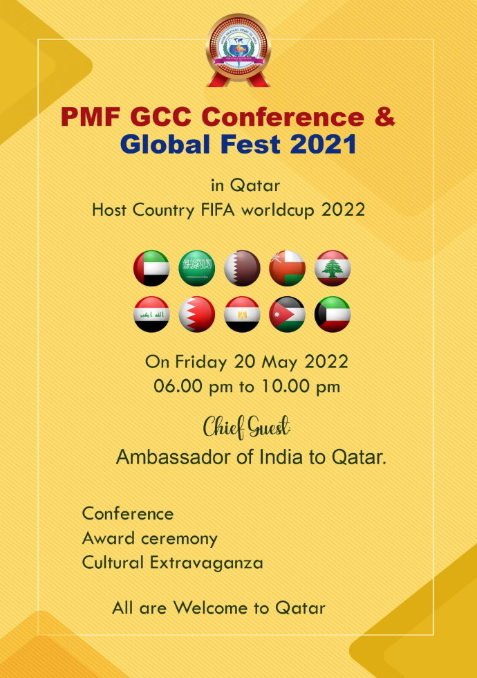 ഗാന്ധി ജയന്തിയോടനുബന്ധിച്ചു പി എം എഫ് ഗ്ലോബൽ സർഗവേദി 2021 നടത്തിയ വിവിധ രാജ്യങ്ങളിലെ വിദ്യാർത്ഥികൾക്കായി സ്നേഹപൂർവ്വം ബാപ്പുജി എന്ന പ്രസംഗ, പ്രബന്ധ മത്സര വിജയികൾക്ക് ഇന്ത്യൻ അംബാസിഡർ അവാർഡുകൾവിതരണം ചെയ്യും, കൂടാതെ ഖത്തറിലെ പി എം എഫ് അംഗങ്ങൾക്ക് ഇന്ത്യൻ എംബസ്സിയുടെ കീഴിലുള്ള ലൈഫ്മെഡിക്കൽ ഇൻഷുറൻസിന്റെ അംഗത്വ വിതരണ കാമ്പയിനും നോർക്ക ഐ ഡി കാമ്പയിനും നടക്കും, കൂടാതെമറ്റു ജി സി സി രാജ്യങ്ങളിലെ സംഘടന പുനഃക്രമീകരണവും, ഡിജിറ്റൽ ഐ ഡി നടപ്പിലാക്കാനുള്ള ശ്രമവും ഉണ്ടാകും. അതോടൊപ്പം കോവിഡ് കാലത്തു സംഘടനക്കൊപ്പം നിന്ന് പ്രവർത്തിച്ചവരെയും, ആരോഗ്യ പ്രവർത്തകരെയും, ഉക്രൈനിലെ വിദ്യാർത്ഥികളെ നാട്ടിൽ തിരിച്ചെത്തിക്കുന്നതിനു സമാനതകൾ ഇല്ലാത്ത പ്രവർത്തനം നടത്തിയവരെയും പ്രത്യേകം ആദരിക്കുകയും ചെയ്യും.