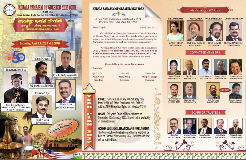 ആഘോഷങ്ങളിലേക്കു ന്യൂയോർക്കിലെ മലയാളികളെ സ്വാഗതം ചെയ്യുന്നു, ഒപ്പം സുവർണജൂബിലി ആഘോഷങ്ങളുടെ ഭാഗമാകാൻ, പ്രെസിഡെന്റ് പോൾ പി. ജോസ്, പ്രസിഡന്റ്, ബോർഡ് ചെയർ ഷാജു സാം, സെക്റട്ടറി മേരി ഫിലിപ്പ്, ട്രെഷറർ ഫിലിപ്പോസ് ജോസഫ് തുടങ്ങിയവർ അഭ്യർത്ഥിച്ചു.