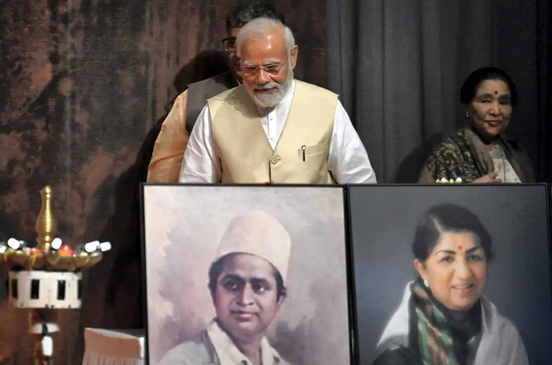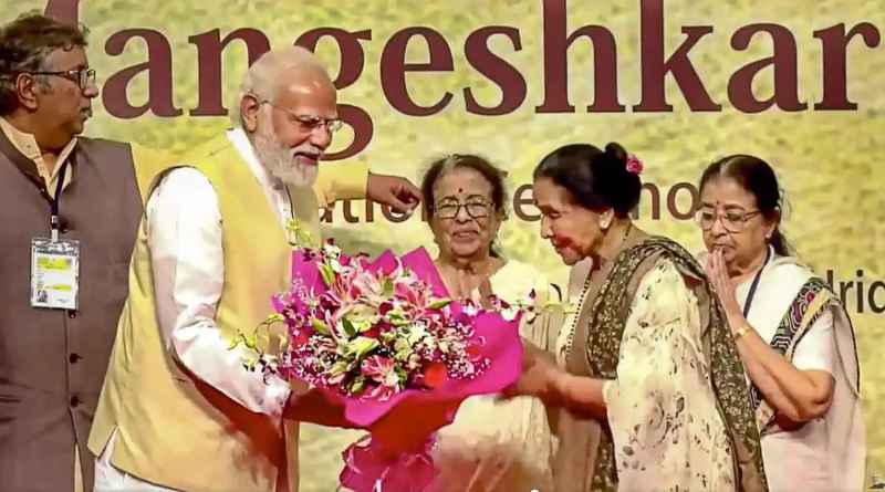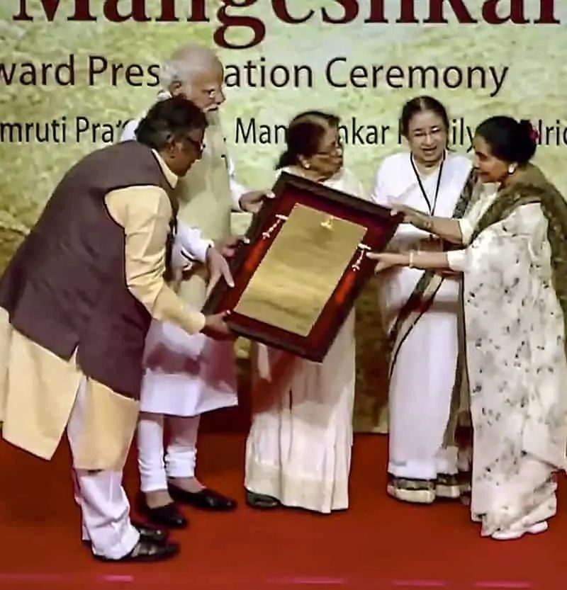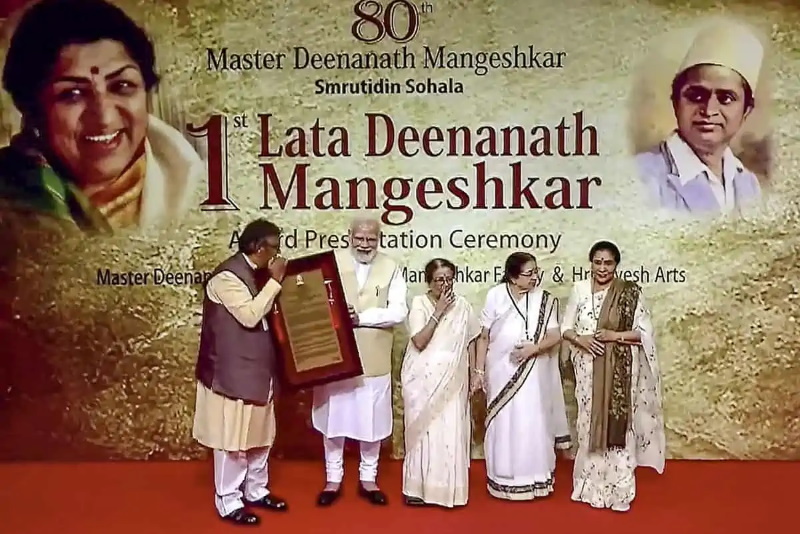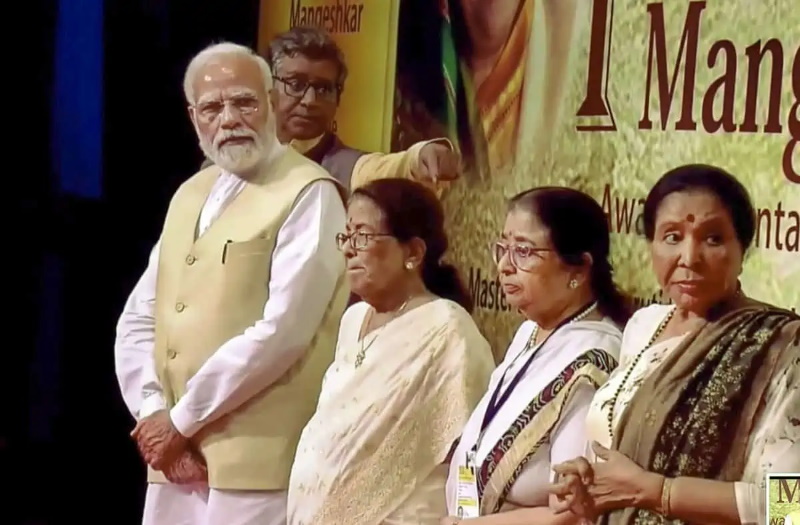 ലതാ ദീനനാഥ് മങ്കേഷ്കർ അവാർഡ് ദാന ചടങ്ങിൽ മങ്കേഷ്കറിന്റെ സഹോദരിമാരും ഗായികരുമായ ആശാ ഭോസ്ലെ, ഉഷാ മങ്കേഷ്കർ, മീന ഖാദികർ എന്നിവർക്കൊപ്പം പ്രധാനമന്ത്രി നരേന്ദ്ര മോദി