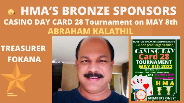 ഹ്യൂസ്റ്റണ്: ഹ്യൂസ്റ്റൺ മലയാളി അസോസിയേഷൻ നടത്തുന്ന ‘കാസിനോ ഡേ’ എന്ന ചീട്ടുകളി മത്സരം മെയ് എട്ടാം തീയതി നടത്തുമെന്ന് ഭാരവാഹികൾ അറിയിച്ചു. മത്സരം വളരെ ചിട്ടയോടും കാര്യഗൗരവത്തോടെയും ഒരുക്കിയിരിക്കുന്നതായും, ഹ്യൂസ്റ്റനിലെ എല്ലാ മലയാളികൾക്കും ഇതിൽ പങ്കെടുക്കുവാൻ സാധിക്കുന്നതാണെന്നും, എച്ച് എം എ ഭാരവാഹികൾ അറിയിച്ചു.