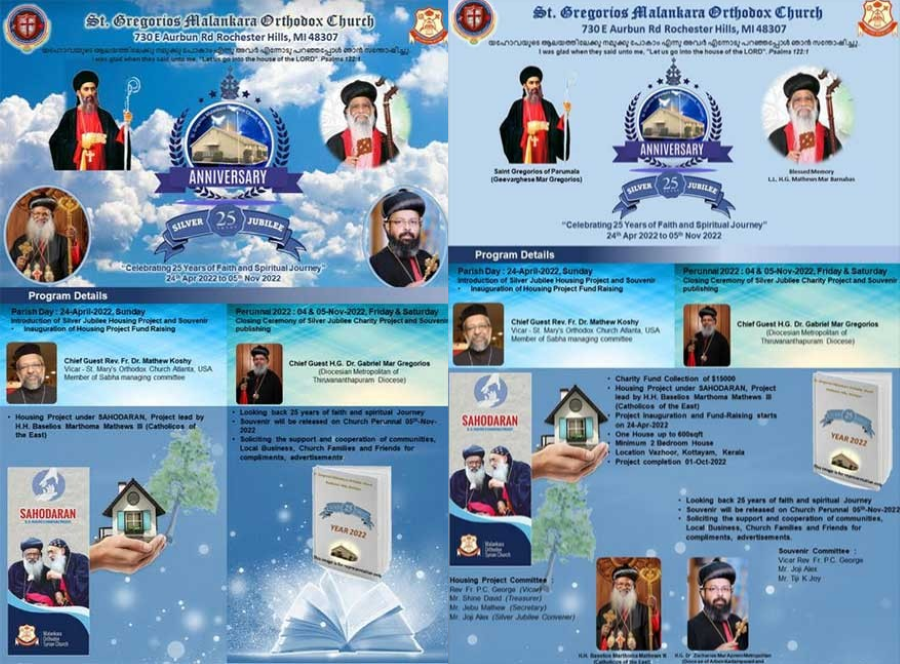 ഡിട്രോയിറ്റ്: മലങ്കര ഓർത്തഡോക്സ് സഭയുടെ സൗത്ത് വെസ്റ്റ് അമേരിക്കൻ ഭദ്രാസനത്തിലുൾപ്പെട്ട റോച്ചസ്റ്റർ ഹിൽസ് സെൻ്റ് ഗ്രീഗോറിയോസ് ഇടവക അനുഗ്രഹകരമായ 25 വർഷങ്ങൾ പിന്നിടുന്നു. പരിശുദ്ധ കാതോലിക്കാ ബാവാ മോറോൻ മാർ ബസേലിയോസ് മാർത്തോമാ മാത്യൂസ് ത്രിതീയൻ, ഭദ്രാസന അസിസ്റ്റൻറ്റ് മെത്രാപ്പോലീത്ത അഭിവന്ദ്യ ഡോക്ടർ സഖറിയാസ് മാർ അപ്രേം മെത്രാപ്പോലീത്താ എന്നിവരുടെ അനുഗ്രഹാശീർവാദത്തോടെ സിൽവർ ജൂബിലി ആഘോഷങ്ങൾക്ക് തുടക്കം കുറിച്ചു. ഇടവക ദിനമായ 2022 ഏപ്രിൽ മാസം 24 മുതൽ പെരുന്നാൾ ദിനമായ നവംബർ മാസം 5 വരെയാണ് സിൽവർ ജൂബിലി ആഘോഷ ക്രമീകരണങ്ങൾ. ഇടവക ദിനത്തോടനുബന്ധിച്ച് സൗത്ത് വെസ്റ്റ് അമേരിക്കൻ ഭദ്രാസനത്തിലെ മലങ്കര സഭാ മാനേജിംഗ് കമ്മറ്റി അംഗമായ Rev. Fr. Dr. Mathew Koshy സിൽവർ ജൂബിലി ആഘോഷങ്ങൾ ഉത്ഘാടനം ചെയ്തു. ദൈവ പരിപാലനയുടെ 25 വർഷങ്ങൾ പൂർത്തീകരിക്കുന്ന ഇടവക, പരിശുദ്ധ ബാവാതിരുമേനിയുടെ ‘സഹോദരൻ’ ചാരിറ്റി പദ്ധതിയിലൂടെ, സഭയുടെ കോട്ടയം ഭദ്രാസനത്തിലുൾപ്പെട്ട വാഴൂർ സെൻ്റ് പീറ്റേഴ്സ് പള്ളി ഇടവകാംഗത്തിന് ഒരു ഭവനം നിർമിച്ച് നൽകുന്നു. പദ്ധതി സമയബന്ധിതമായി പൂർത്തിയാകുന്ന പക്ഷം, ‘സഹോദരൻ ‘ പദ്ധതിയിലൂടെ പൂർണമായി പൂർത്തീകരിക്കപ്പെടുന്ന ആദ്യ ഭവനമായിരിക്കുമിത്.