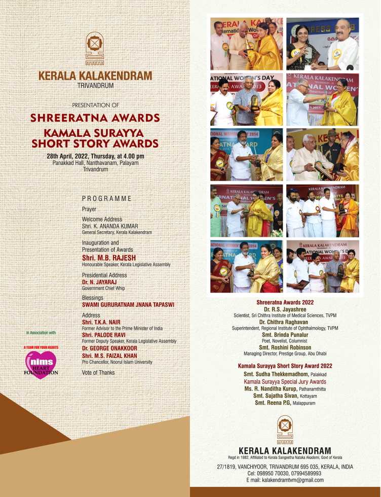 10000 രൂപയും ഫലകവും സർട്ടിഫിക്കറ്റും അടങ്ങുന്ന 2022ലെ കമലാ സുരയ്യ ചെറുകഥാ അവാർഡ് സുധ തെക്കെമഠത്തിൽ, സ്പെഷ്യൽ ജൂറി അവാർഡ് ആർ നന്ദിതാ കുറുപ്പ്, സുജാത ശിവൻ, റീന ബിജി എന്നിവർക്കും സമ്മാനിക്കും.