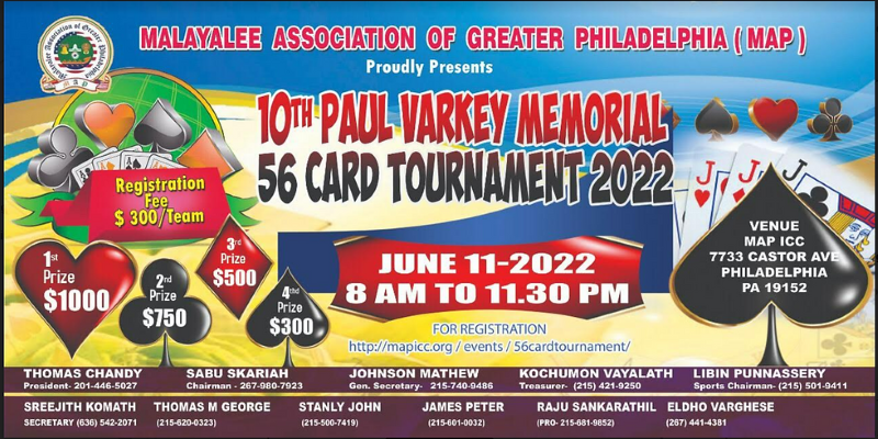 ഫിലഡൽഫിയാ: മലയാളി അസോസിയേഷൻ ഓഫ് ഗ്രെയ്റ്റർ ഫിലാഡൽഫിയായുടെ (MAP) ആഭിമുഖ്യത്തിൽ പത്താമത് പോൾ വർക്കി മെമ്മോറിയൽ എവർ റോളിങ് ട്രോഫി 56 – ചീട്ടുകളി മത്സരം ജൂൺ 11 – ന് ശനിയാഴ്ച രാവിലെ 8 മണി മുതൽ രാത്രി 11:30 വരെയുള്ള സമയങ്ങളിൽ മാപ്പ് ഇന്ത്യന് കമ്മ്യൂണിറ്റി സെന്ററില് വച്ച് (7733 Castor Ave , Philadelphia , PA 19152) നടത്തുന്നതിനുള്ള ഒരുക്കങ്ങൾ പുരോഗമിക്കുന്നതായി മാപ്പ് പ്രസിഡണ്ട് തോമസ് ചാണ്ടി, സാബു സ്കറിയാ (ടൂർണമെന്റ് ചെയർമാൻ),ജോൺസൺ മാത്യു, (ജനറൽ സെക്രട്ടറി), കൊച്ചുമോൻ വയലത്ത് (ട്രഷറാർ), ലിബിൻ പുന്നശ്ശേരി,(സ്പോർട്ട്സ് ചെയർമാൻ) എന്നിവർ അറിയിച്ചു.