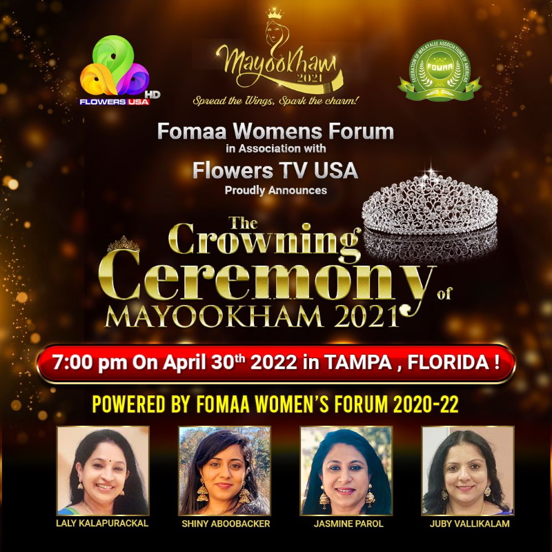 ഫോമയുടെ ഫ്ലോറിഡയിലെ റ്റാമ്പായിൽ വെച്ച് നടക്കുന്ന ഇടക്കാല പൊതുയോഗ വേദിയിൽ മയൂഖം വേഷവിധാന മത്സര വിജയികളുടെ കിരീടധാരണം നടക്കും.