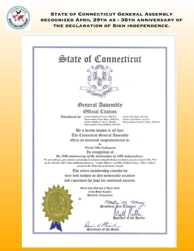 Global Organization of People of Indian Origin (GOPIO) – Connecticut Chapter deplores the citation by a few members of Connecticut General Assembly congratulating declaration of Sikh Independence.