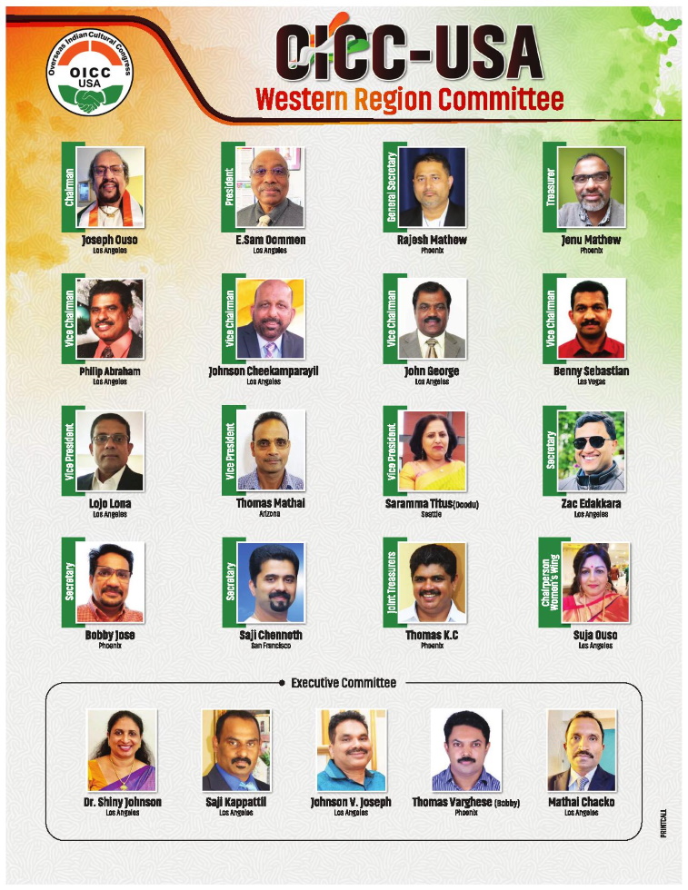 ന്യൂയോർക്ക്: ഓവർസീസ് ഇന്ത്യൻ കൾച്ചറൽ കോൺഗ്രസ് (ഒഐസിസി) യുഎസ്എ വെസ്റ്റേൺ റീജിയൻ ഭാരവാഹികളെ കെപിസിസി പ്രസിഡണ്ട് കെ. സുധാകരന്റെ ഔദ്യോഗിക അംഗീകാരത്തോടെ ഒഐസിസി ഗ്ലോബൽ ചെയർമാൻ കുമ്പളത്ത് ശങ്കരപ്പിള്ള പ്രഖ്യാപിച്ചു.