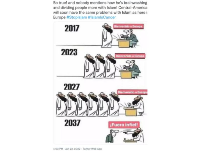 • #Eurabia #Islamification തുടങ്ങിയ ഹാഷ്ടാഗുകൾക്കൊപ്പം മുസ്ലീം കുടിയേറ്റത്തെ “ഒരു അധിനിവേശം” എന്ന് കാണിക്കുന്ന പോസ്റ്റുകളിൽ നടപടിയെടുക്കുന്നതിൽ അവർ പരാജയപ്പെട്ടു.