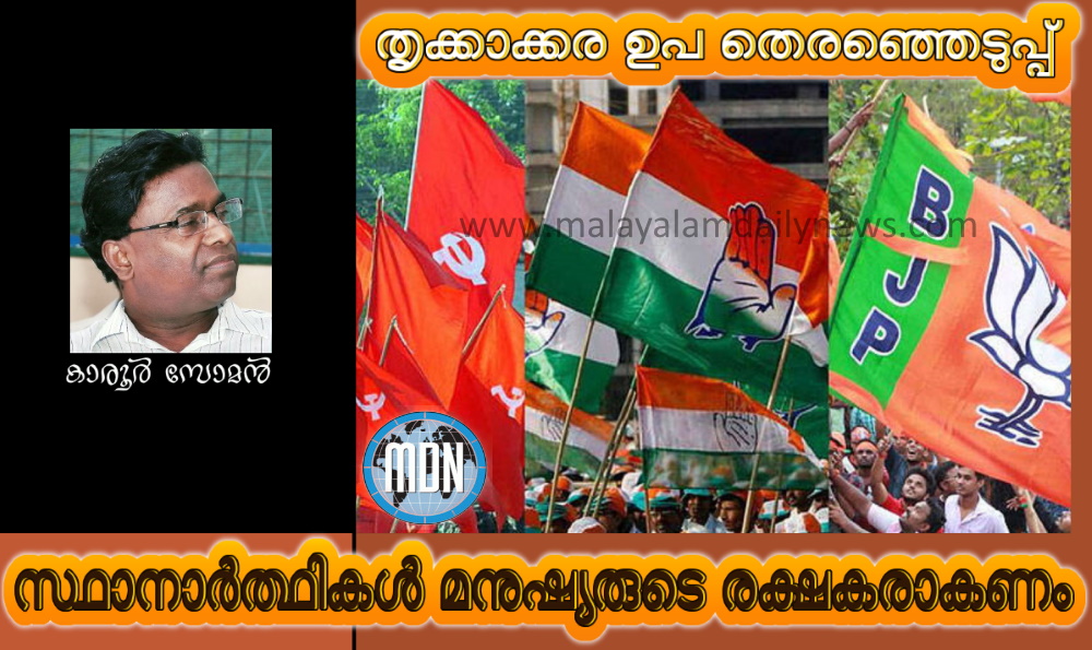 എറണാകുളം തൃക്കാക്കര തെരഞ്ഞെടുപ്പില് ഞെക്കിപ്പഴുപ്പിച്ച പഴംപോലെ ജാതി മത രാഷ്ട്രീയത്തില് ഞെളിഞ്ഞു കയറാന് ചൂടോടെ വാദപ്രതിവാദം നടത്തുന്നതും, വിത്തിനൊത്ത വിളപോലെ വായില് ജാതി തേനും മനസ്സില് വര്ഗ്ഗീയ വിഷവുമായി വാതംപിടിച്ച കുതിരയെ പോലെ സമനില തെറ്റി നടക്കുന്ന അധിക പ്രസംഗികളെയും കണ്ടു. ഒരു രാഷ്ട്രീയ പാര്ട്ടി സ്ഥാനാര്ത്ഥിയെ നിറുത്തിയാല് തന്റെ രണ്ടു കണ്ണുപോയാലും തെറ്റില്ല അന്യന്റെ ഒന്നെങ്കിലും കളയണമെന്ന രാഷ്ട്രീയ കപട സദാചാര ബോധം മാറ്റി സൂക്ഷ്മ നീരിക്ഷണ ബുദ്ധിയോടെ കണ്ണുകള് തുറന്ന് വികസിത മനസ്സോടെ കാണാനാണ് ശ്രമിക്കേണ്ടത്. ഇടതുപക്ഷത്തുള്ള സ്ഥാനാര്ത്ഥിയെ കാണേണ്ടത് അന്ധമായ ഏതെങ്കിലും വിശ്വാസ-പ്രമാണങ്ങള്ക്ക് അടിമയായ ഒരു വ്യക്തിയാ യിട്ടല്ല അതിലുപരി ഹൃദയശസ്ത്രക്രിയ നടത്തി ജീവന് രക്ഷപ്പെടുത്തുന്ന മനുഷ്യരുടെ രക്ഷകനായിട്ടാണ്. പൊതുസമൂഹത്തില് നിന്ന് വര്ഗ്ഗീയത, അധികാരമോഹികളല്ലാത്തവരെ രാഷ്ട്രീയ പാര്ട്ടികള് രംഗത്ത് കൊണ്ടു വരണം. ഇതില് നിരാശയാനുഭവിക്കുന്നവര് കാണേണ്ടത് പാരമ്പര്യമായി, കുടുംബമായി സ്വന്തമാക്കികൊണ്ടിരിക്കുന്ന പ്രത്യുപകാര അധികാര രാഷ്ട്രീയ തെരഞ്ഞെടുപ്പ് പരമ്പര അവസാനിക്കുന്നതാണ്. ഇടത്തുപക്ഷം ഒരു ഡോക്ടറെ സ്ഥാനാര്ഥിയാക്കുമ്പോള് അതിനേക്കാള് മികച്ചൊരു ഡോക്ടറെ നിറുത്തി കരുത്തുകാട്ടുക യാണ് മറുഭാഗത്തുള്ളവര് ചെയ്യേണ്ടത്. വികസന രാഷ്ട്രീയം പോലെ വികസന ഹൃദയ ശസ്ത്രക്രിയ നടത്തുന്ന ഒരു സ്ഥാനാര്ഥി കൂടുതല് ഹൃദയസ്പര്ശിയായി ആരോഗ്യ രംഗത്തു് താങ്ങും തണലുമായി വ്യാകുലപ്പെടുന്ന വര്ക്ക് കൂടുതല് ഊര്ജ്ജം പകരട്ടെ.
