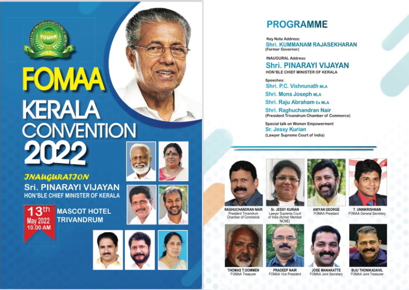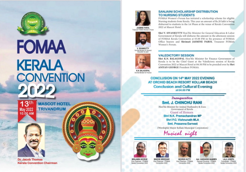 ഫോമയുടെ ഏഴാമത് കേരള കൺവെൻഷൻ, മെയ് 13-14 തീയതികളിൽ തിരുവനനന്തപുരത്ത് മസ്കറ്റ് ഹോട്ടലിൽ വെച്ച് നടക്കും. കേരള മുഖ്യമന്ത്രി പിണറായി വിജയൻ കൺവെൻഷൻ ഉദ്ഘാടനം ചെയ്യും. പ്രതിപക്ഷ നേതാവ് വി.ഡി.സതീശൻ, പ്രമുഖ എഴുത്തുകാരനും, എംപിയുമായ ശശി തരൂർ, മുൻ വിദ്യാഭ്യാസ മന്ത്രി എം.എ ബേബി, മുൻ മിസോറാം ഗവർണർ കുമ്മനം രാജശേഖരൻ, പ്രമുഖ മാധ്യമ പ്രവർത്തകനും എംപിയുമായ ജോൺ ബ്രിട്ടാസ്, പ്രേമചന്ദ്രൻ എം.പി, മുൻമന്ത്രിയും നടനും എം.എൽ.എയുമായ കെ.ബി.ഗണേഷ് കുമാർ, പ്രതിഭാ ഹരി എംഎല്എ, മുൻ എം.എൽ.എ രാജു എബ്രഹാം, പ്രമുഖ സാമൂഹ്യ പ്രവർത്തകയും സുപ്രീം കോടതി അഭിഭാഷകയുമായ സിസ്റ്റർ ജെസി കുര്യൻ എന്നിവർ പങ്കെടുക്കും.