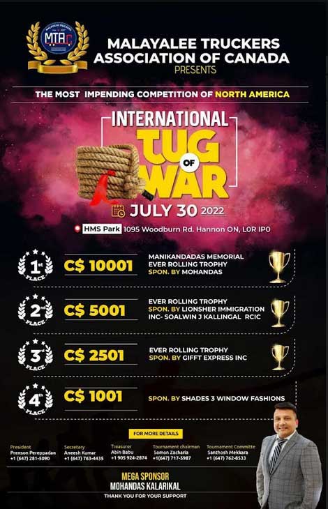 ടൊറന്റോ: മലയാളികളെ ആവേശത്തിലാഴ്ത്തി നോർത്ത് അമേരിക്കയിലെ ഏറ്റവും വലിയ രാജ്യാന്തര വടംവലി മത്സരത്തിന് മലയാളി ട്രക്കേഴ്സ് അസ്സോസിയേഷൻ ഓഫ് കാനഡ (MTAC) ഒരുങ്ങുന്നു. കാനഡയിൽ നിന്നുള്ള ടീമുകൾക്ക് പുറമെ അമേരിക്ക, മാൾട്ട, ഖത്തർ തുടങ്ങി വിവിധ രാജ്യങ്ങളിൽ നിന്നുള്ള ടീമുകളെയും മത്സരത്തിന് പ്രതീക്ഷിക്കുന്നുണ്ട്. ഹാമില്ട്ടണ് മലയാളി സമാജം ഗ്രൗണ്ടിൽ 2022 ജൂലൈ 30നാണു മത്സരം നടക്കുക. 590 കിലോഗ്രാം (1300 പൗണ്ട്) വിഭാഗത്തിൽ നടക്കുന്ന മത്സരത്തിൽ നോർത്ത് അമേരിക്കയിലെ പ്രമുഖ ടീമുകൾ പങ്കെടുക്കും.