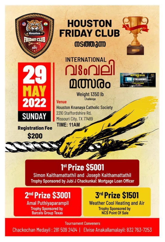ഹ്യൂസ്റ്റൺ: ആറു രാജ്യങ്ങളിൽ നിന്നായി പതിനെട്ടു ടീമുകൾ പങ്കെടുക്കുന്ന വടംവലി എന്ന കായിക വിനോദ ചരിത്രത്തിലെ തന്നെ ഒരു പുതിയ അദ്ധ്യായം മെയ് 29നു ഹൂസ്റ്റണിലെ ക്നാനായ സെന്ററിൽ അരങ്ങേറുന്നു.