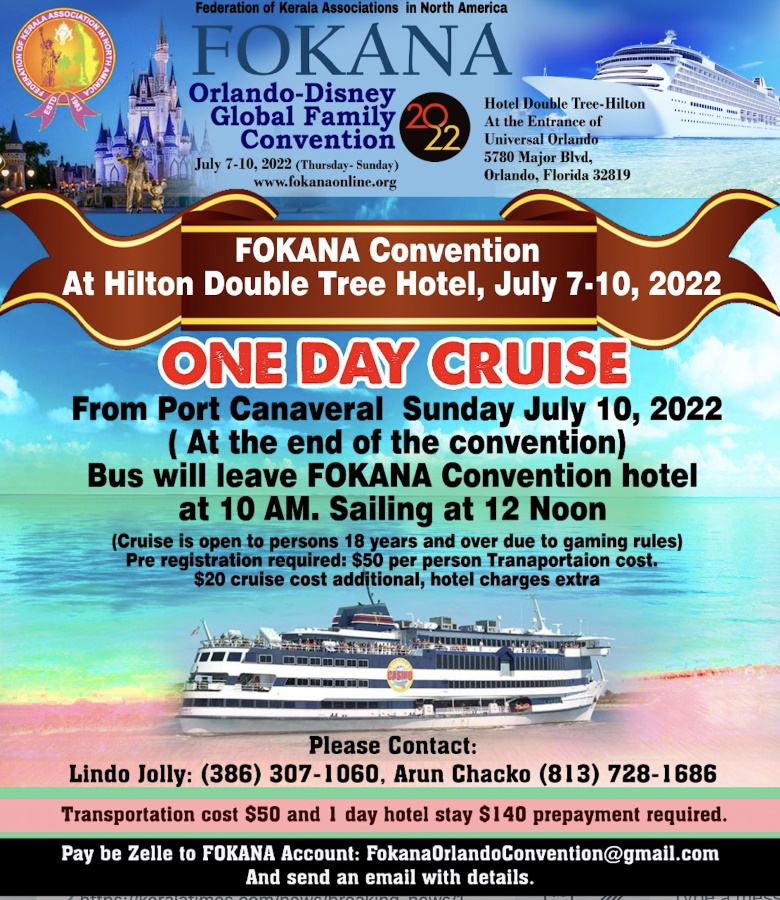 കാസിനോസിക്രൂയിസ് ആയതിനാൽ ഗെയിം നിയമപ്രകാരം 18 വയസിന് മുകളിലുള്ളവർക്ക് മാത്രമായിരിക്കും ഈ യാത്രയിൽ പങ്കെടുക്കാനായി അനുമതി ലഭിക്കുകയുള്ളു. യാത്രയ്ക്കായി ഒർലാണ്ടോയിൽ നിന്ന് സീപോർട്ടിലേക്കുള്ള ബസ് യാത്രക്കായി 50 ഡോളർ ആൺ ഒരാളിൽ നിന്നും ഈടാക്കുക. താമസം ആവശ്യമുള്ളവർക്ക് ഹോട്ടൽ നിരക്കടക്കം നൽകേണ്ടിവരും. ഹോട്ടലിൽ ബുക്ക് ചെയ്യണമെങ്കിൽ 140 ഡോളർ ആണ് നിരക്ക്. ഒരാൾക്ക് 20 ഡോളർ വീതമാണ് ക്രൂയിസ് യാത്രയ്ക്ക് നൽകേണ്ട ടിക്കറ്റ് നിരക്ക്. മുൻകൂട്ടി പണമടച്ച് ബുക്ക് ചെയ്യുന്നവർക്കായിരിക്കും വൺഡേ ക്രൂസ് യാത്രയിൽ പങ്കെടുക്കാൻ അനുമതിയുള്ളു. കപ്പൽ യാത്രയും അനുബന്ധ ചെലവുകൾക്കുമുള്ള തുക zelle ആയും ഫൊക്കാന അക്കൗണ്ടിലേക്ക് അയക്കാവുന്നതാണ്. FokanaOrlandoConvention@gmail.com എന്ന ഇമെയിൽ വിലാസത്തിൽ zelle വഴി പണമയയ്ക്കാവുന്നതാണ്.