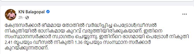 പെട്രോൾ നികുതി 2.41 രൂപയും ഡീസൽ നികുതി 1.36 രൂപയും സംസ്ഥാന സർക്കാർ കുറയ്ക്കുമെന്ന് കെഎന് ബാലഗോപാല് പറഞ്ഞു. കേന്ദ്രസർക്കാർ ഭീമമായ തോതിൽ വർദ്ധിപ്പിച്ച പെട്രോൾ/ഡീസൽ നികുതിയിൽ ഭാഗികമായ കുറവ് വരുത്തിയത് സ്വാഗതാർഹമാണെന്നും ധനമന്ത്രി ഫേസ്ബുക്കില് കുറിച്ചു